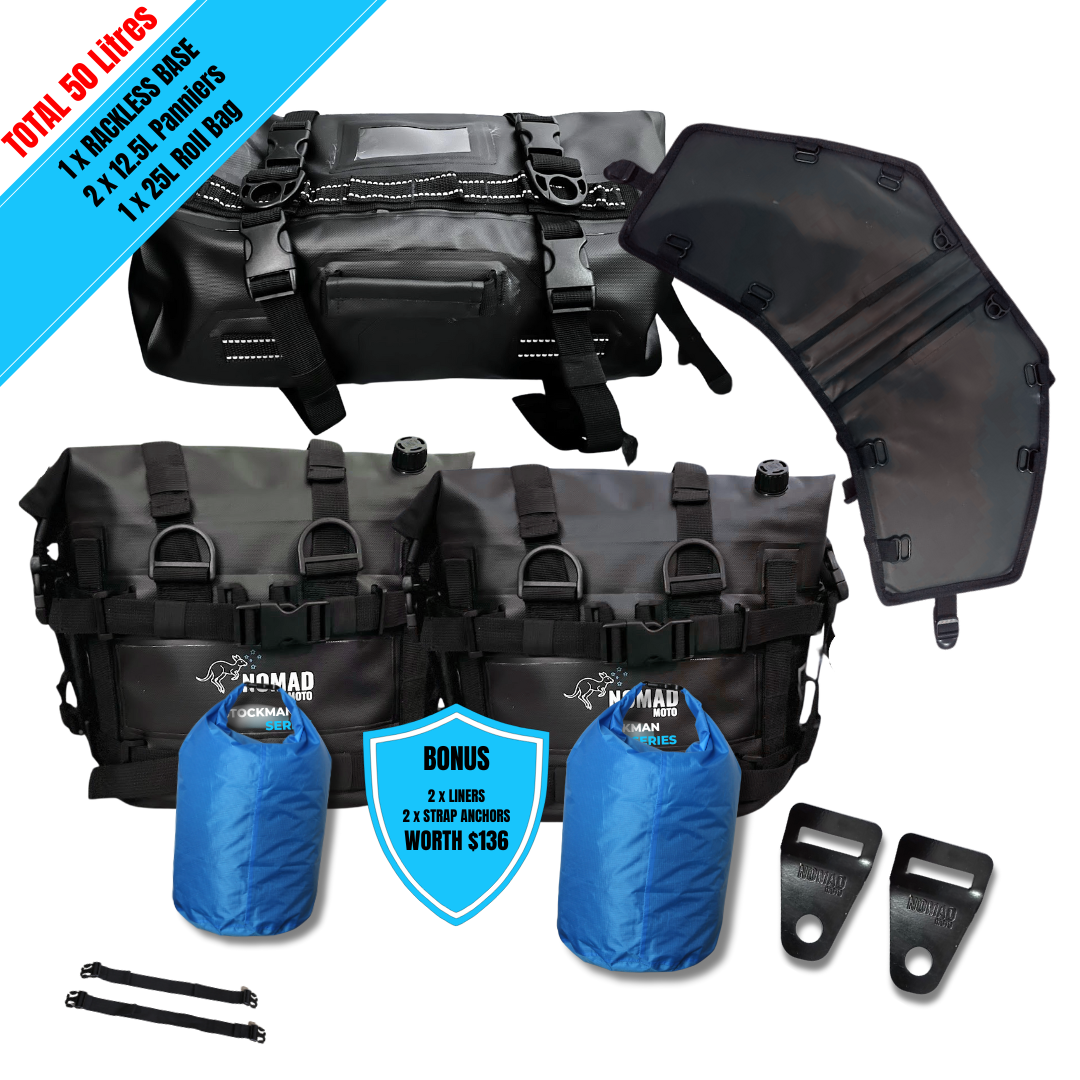 2 x 12.5L Soft Panniers + 25L Roll Bag + Rackless Base